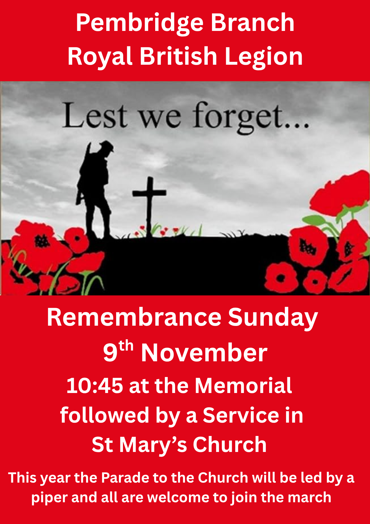 Royal British Legion Parade from War Memorial to Pembridge Church led by Keith the Piper.