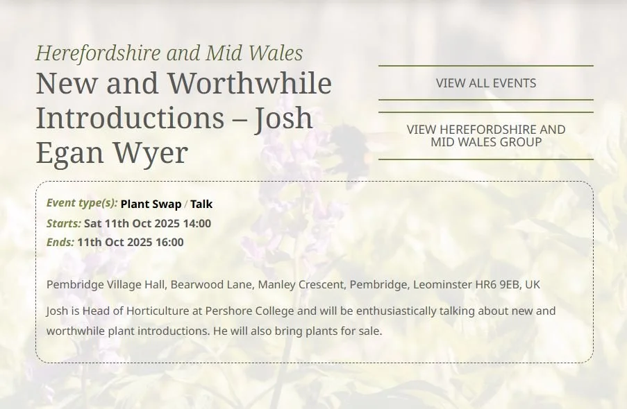 The Hardy Plant Society meets at Pembridge Parish Hall 2pm-4pm for a talk by Josh Egan Wyer, Head of Horticulture at Pershore College, “New and Worthwhile Introductions”. Plant Sale. All welcome.