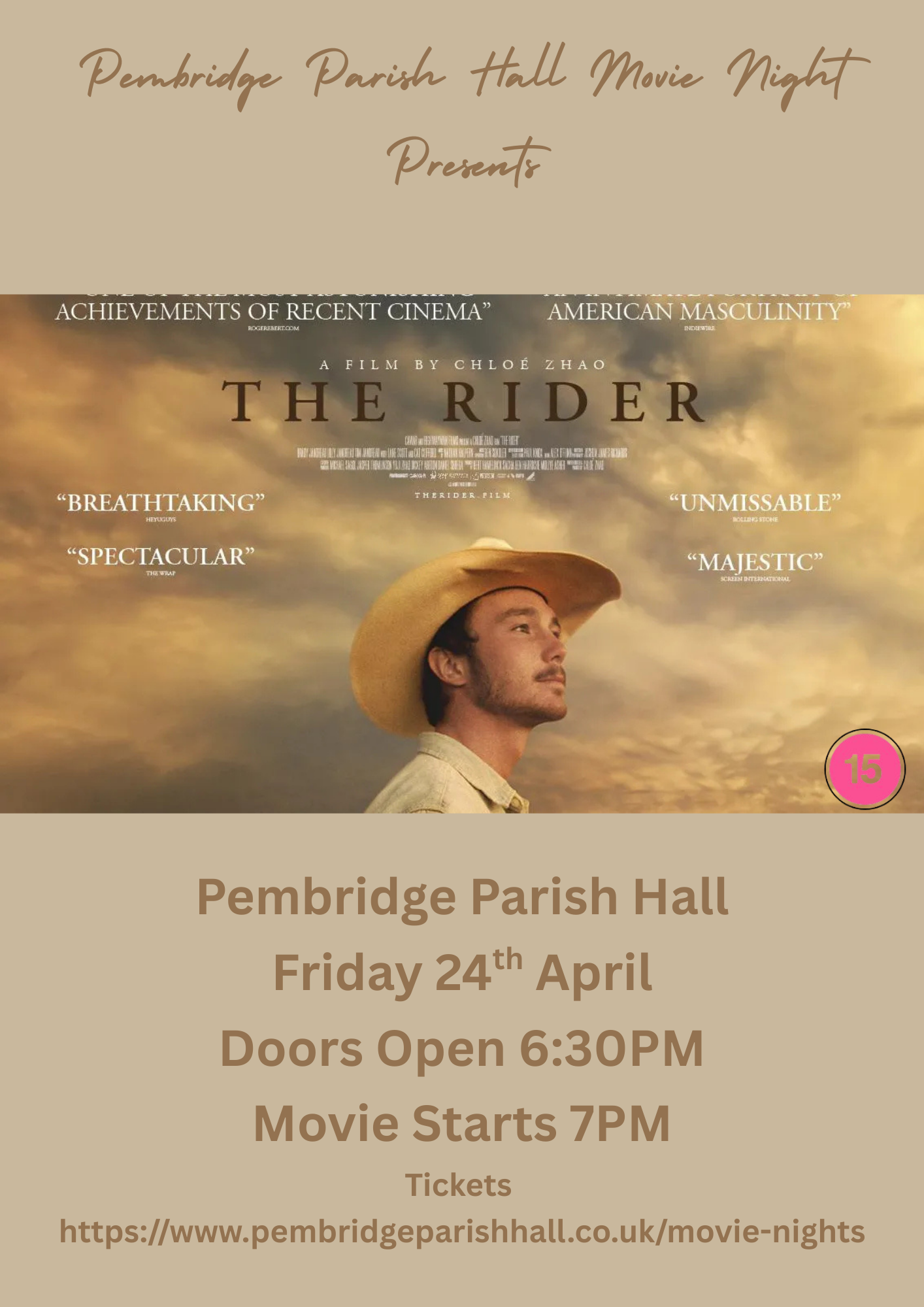 Back to All Events Movie Night: The Rider Friday 24 April 2026 18:30 21:30 Pembridge Parish Hall Bearwood Lane, Pembridge HR6 9EB (map) Google Calendar ICS Brady Blackburn, a rodeo rider, meets with an accident that leaves him with a severe brain damage. He refuses to quit horse riding despite the doctor's warning.
