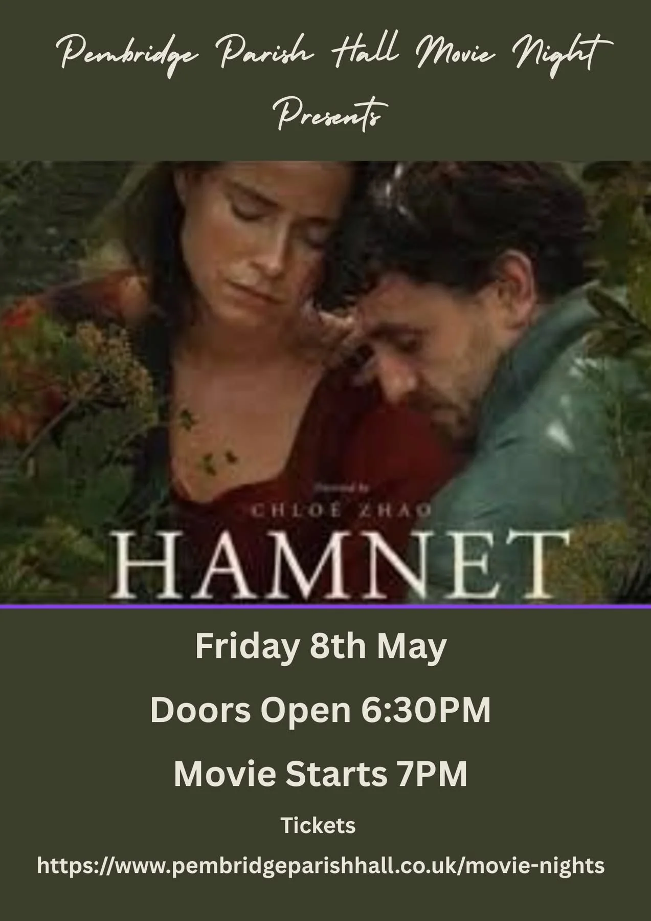 Back to All Events Movie Night: Hamnet Friday 8 May 2026 18:30 21:30 Pembridge Parish Hall Bearwood Lane, Pembridge HR6 9EB (map) Google Calendar ICS William Shakespeare and his wife, Agnes, celebrate the birth of their son, Hamnet. However, when tragedy strikes and Hamnet dies at a young age, it inspires Shakespeare to write his timeless masterpiece "Hamlet."