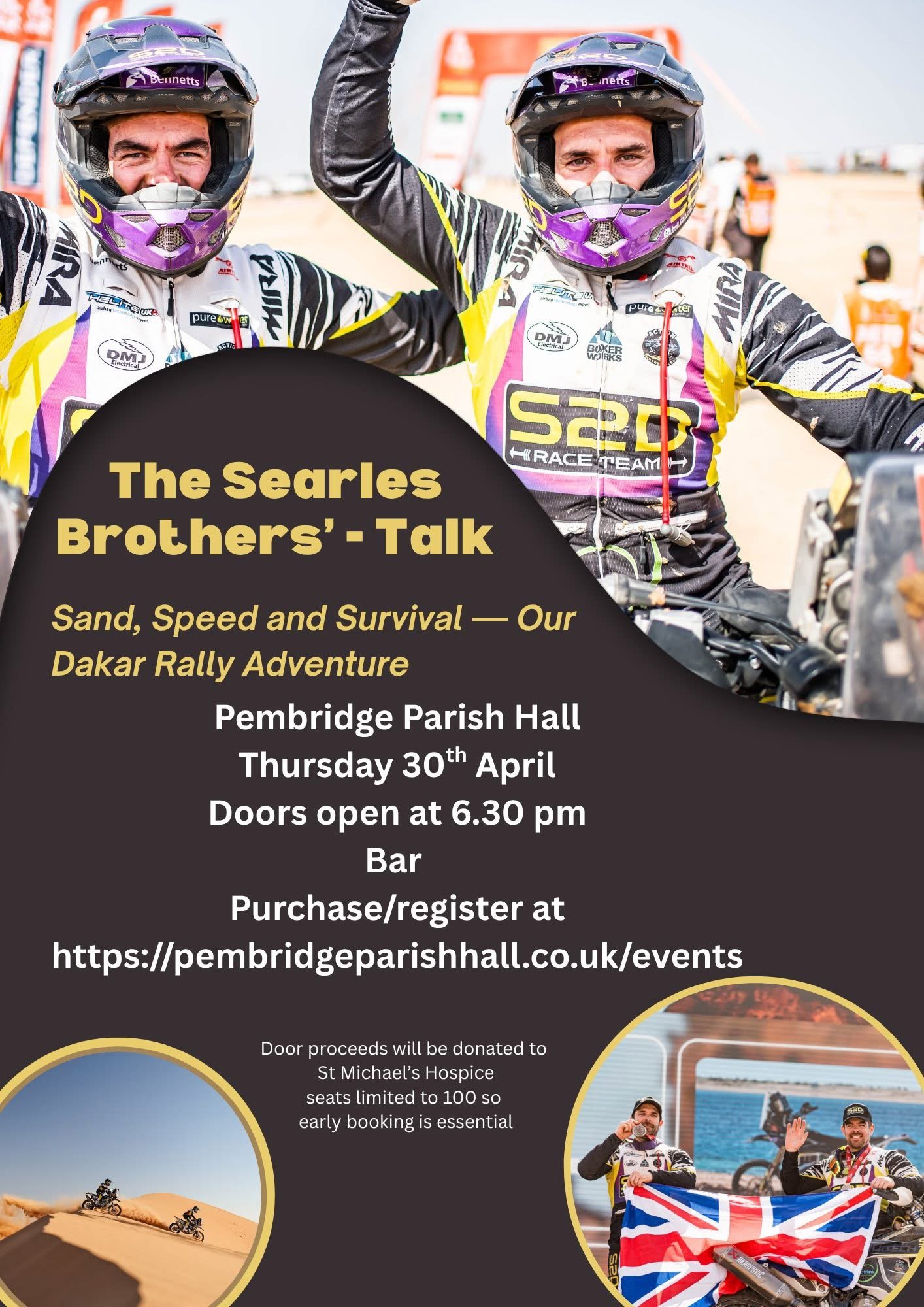 Back to All Events Talk: The Searles Brothers - Sand, Speed and Survival, Our Dakar Rally Adventure Thursday 30 April 2026 18:30 21:30 Pembridge Parish Hall Bearwood Lane, Pembridge HR6 9EB (map) Google Calendar ICS