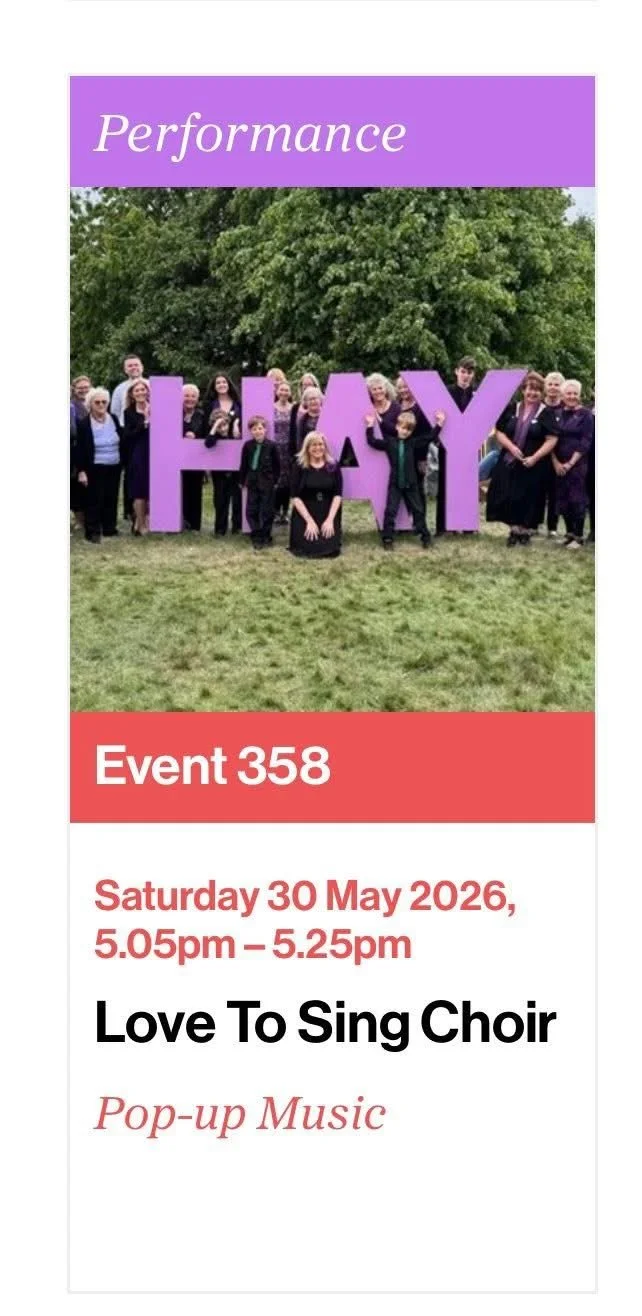 Love to Sing Choir (Copy) Saturday 30 May 2026 17:05 17:25 The Hay Literary Festival Hay on Wye HR3 5PJ (map) Google Calendar ICS