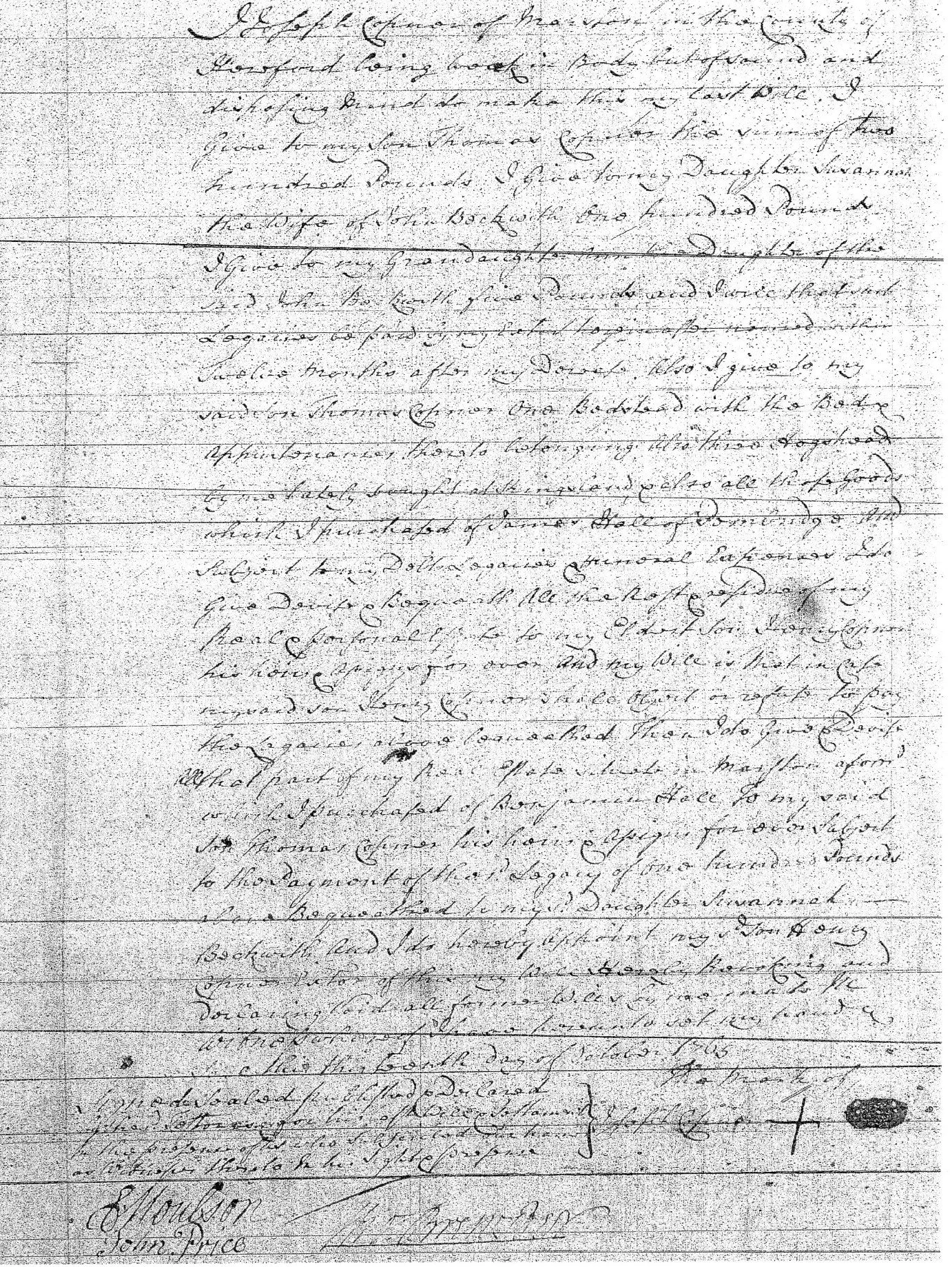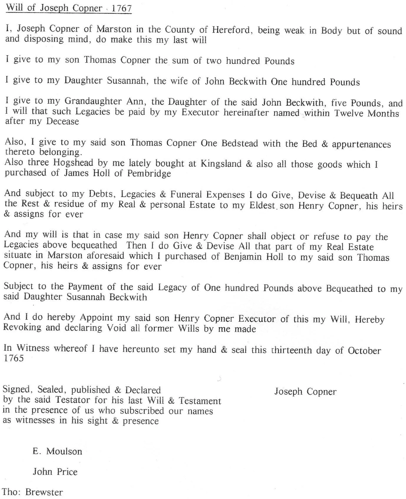 Will of Joseph Copner 1767 (Age 71 years)