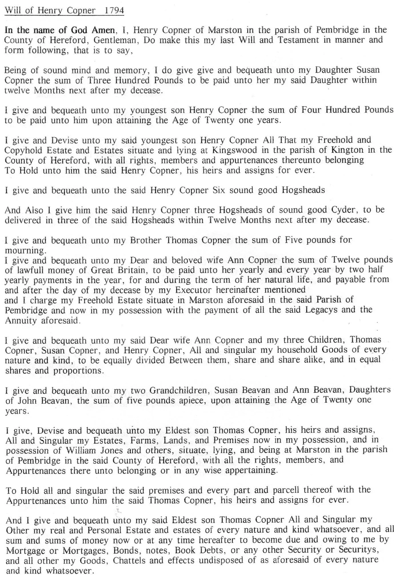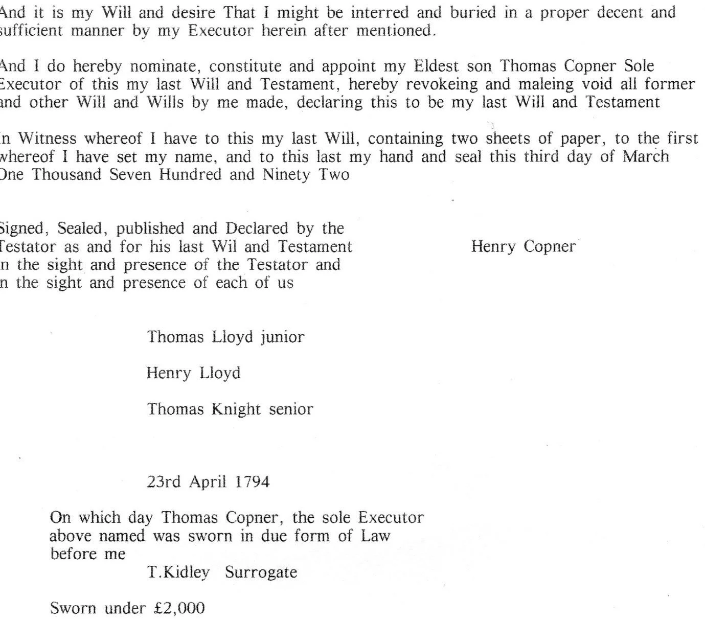 Will of Henry Copner 1794 (Age 67 years)