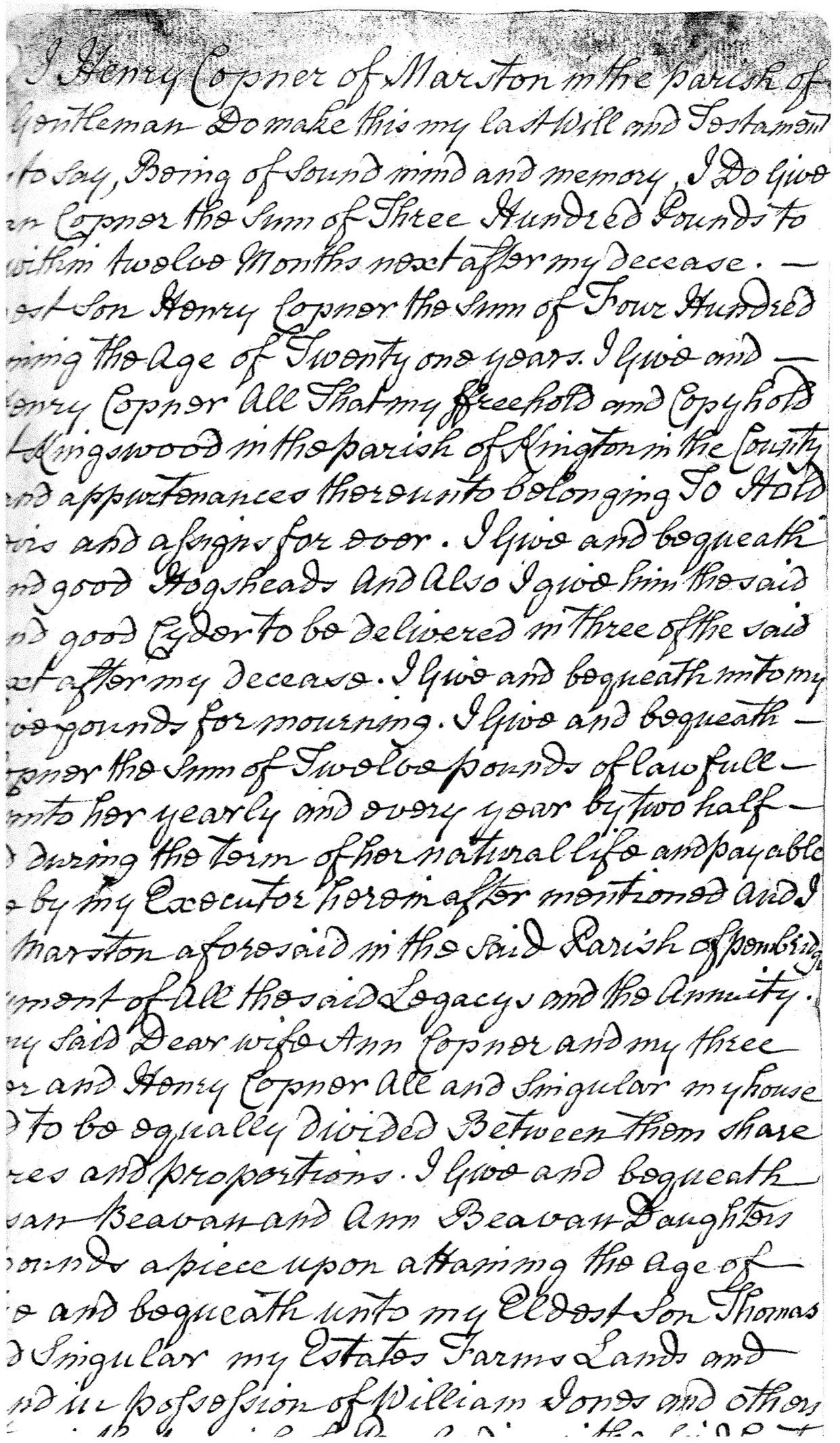 Will of Henry Copner 1729 (Age 51 yrs)