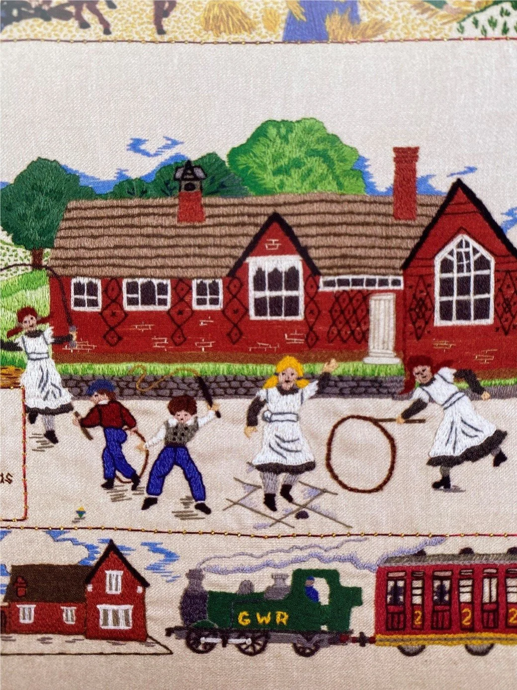 Detail from the Pembridge Tapestries showing the mid-Victorian Pembridge station and Village Primary School. The tapestries are displayed in St Mary’s Church Pembridge.