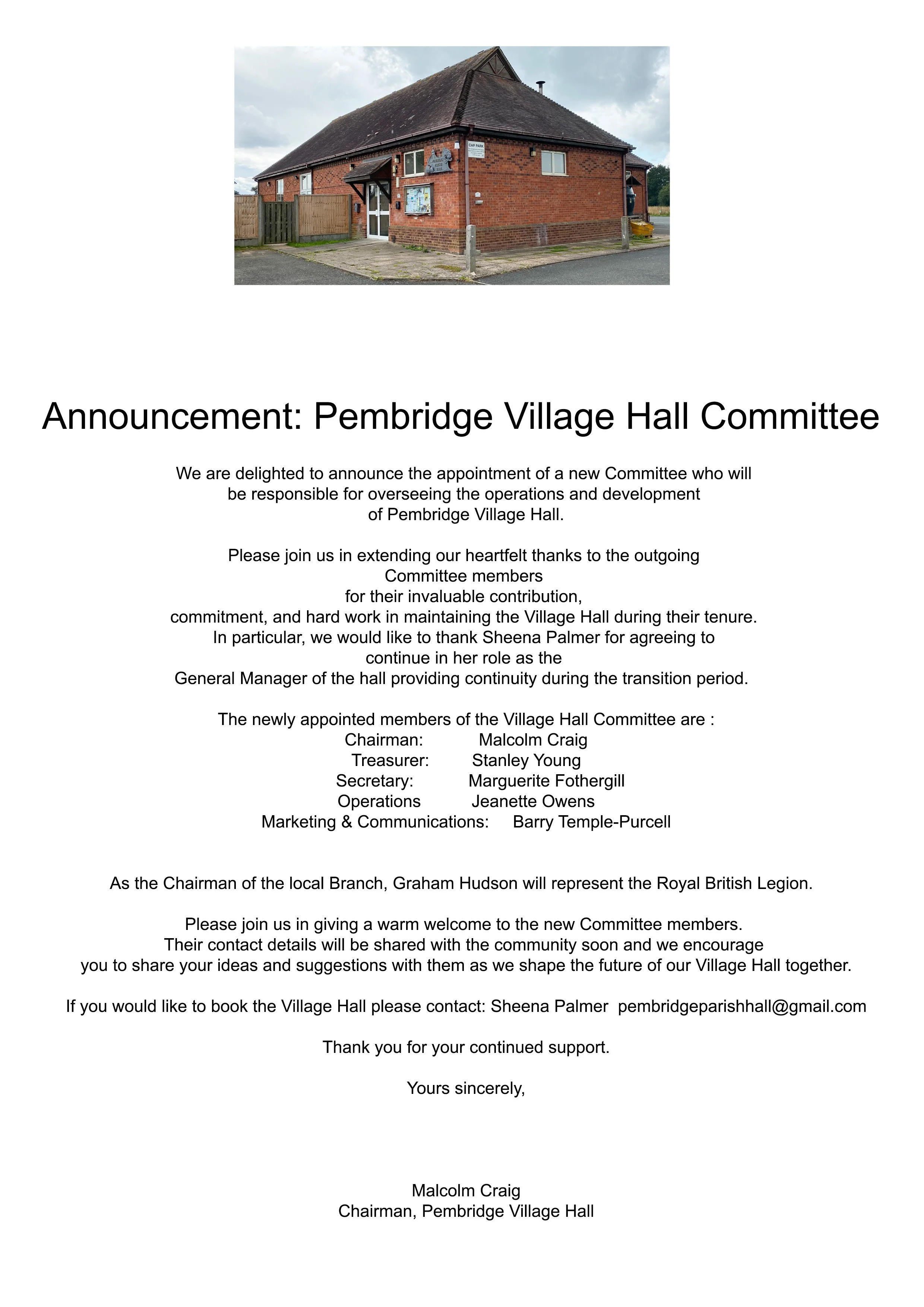 Pembridge Village Hall Committee NewsVillage NewsVillage Hall 22 Jul Written By Barry Temple-Purcell NewsVillage NewsVillage Hall Barry Temple-Purcell