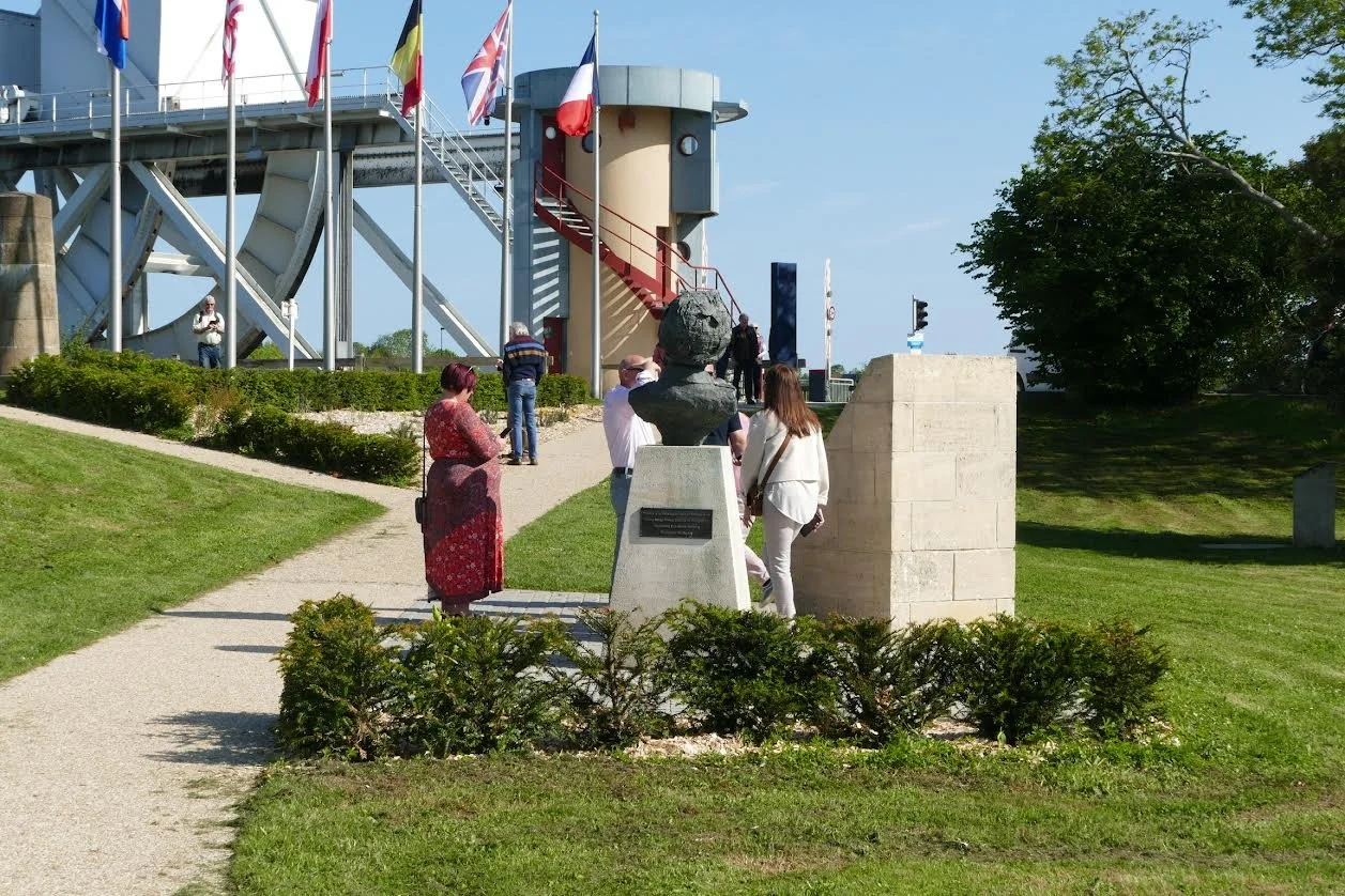 Bromley O’Hare, one of our party, had created a memorial of Pegasus Bridge in the form of three circling gliders which is displayed at the National Arboretum in Staffordshire. Bromley was able to see for the first-time parts of the gliders he sculpted and a full-size reproduction of one of them.